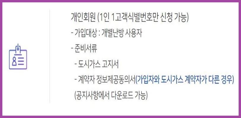중앙난방을 사용하는 경우에는 개인이 신청하는 것은 불가하지만 공동주택 관리사무소나 입주자 대표회의에서 신청이 가능해요. 준비서류로는 사업자등록증(고유번호증), 법인통장사본, 도시가스 고지서가 필요해요.