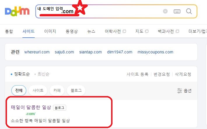 >> 네이버나 구글은 최척화되기까지 시간이 많이 소요되기 때문에 최적화여부 확인을 위해 가끔씩 다음 검색창에 티스토리 주소(도메인 주소)를 검색해 보는 것을 추천드립니다.