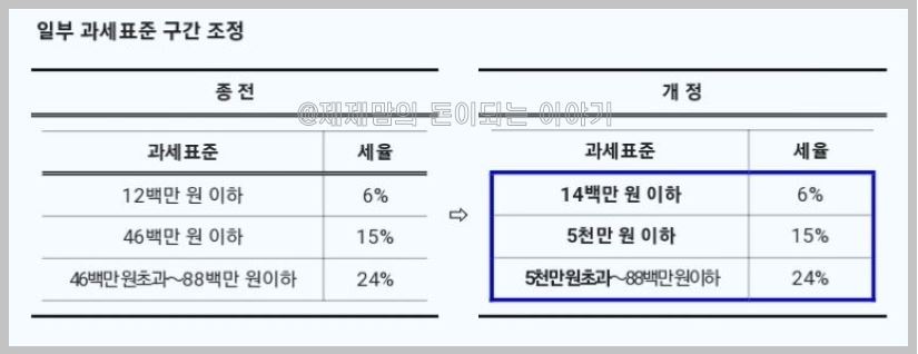 소득 과세표준 하위 3구간 조정 : 서민층과 중산충의 세부담을 완화하기 위하여 일부 소득세 과세표준 구간 기준 금액을 상향 조정했습니다.