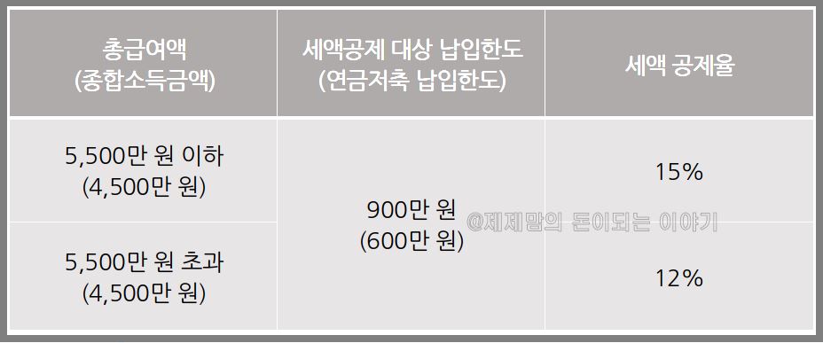 - 세액공제대상 납입 한도는 연금저축 600만 원, 퇴직 연금포함 900만 원한도로통일